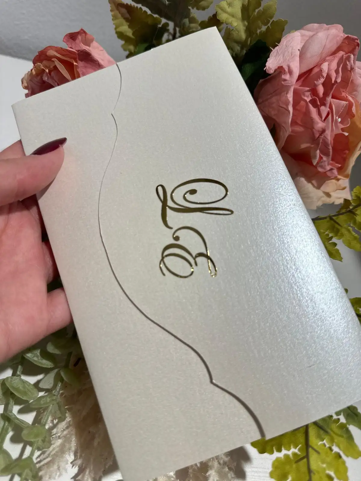 Realizzata su cartoncino avorio perlato, luminoso e prezioso al tatto, e impreziosita da una stampa in lamina oro che brilla con eleganza, è pensata per chi desidera un matrimonio raffinato, romantico e curato in ogni dettaglio.