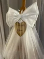 Il grande fiocco in tessuto, morbido e vaporoso, ha una larghezza di circa 50 cm e sostiene una targhetta in legno a cuore incisa con la scritta che preferisci.